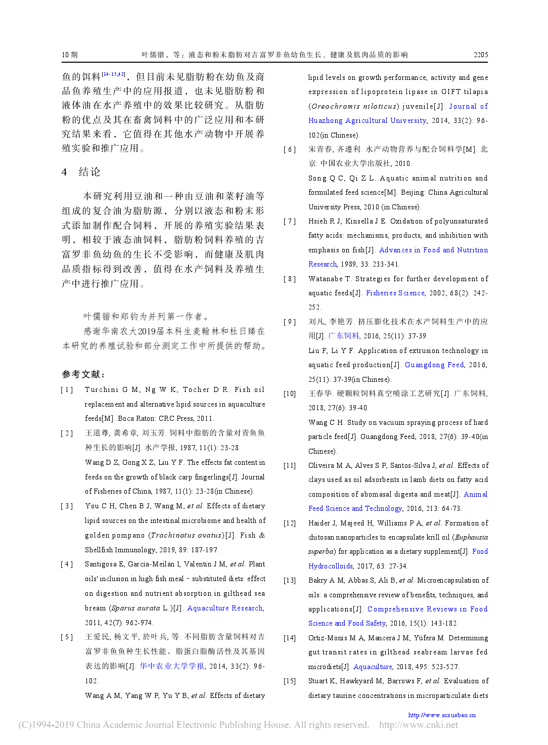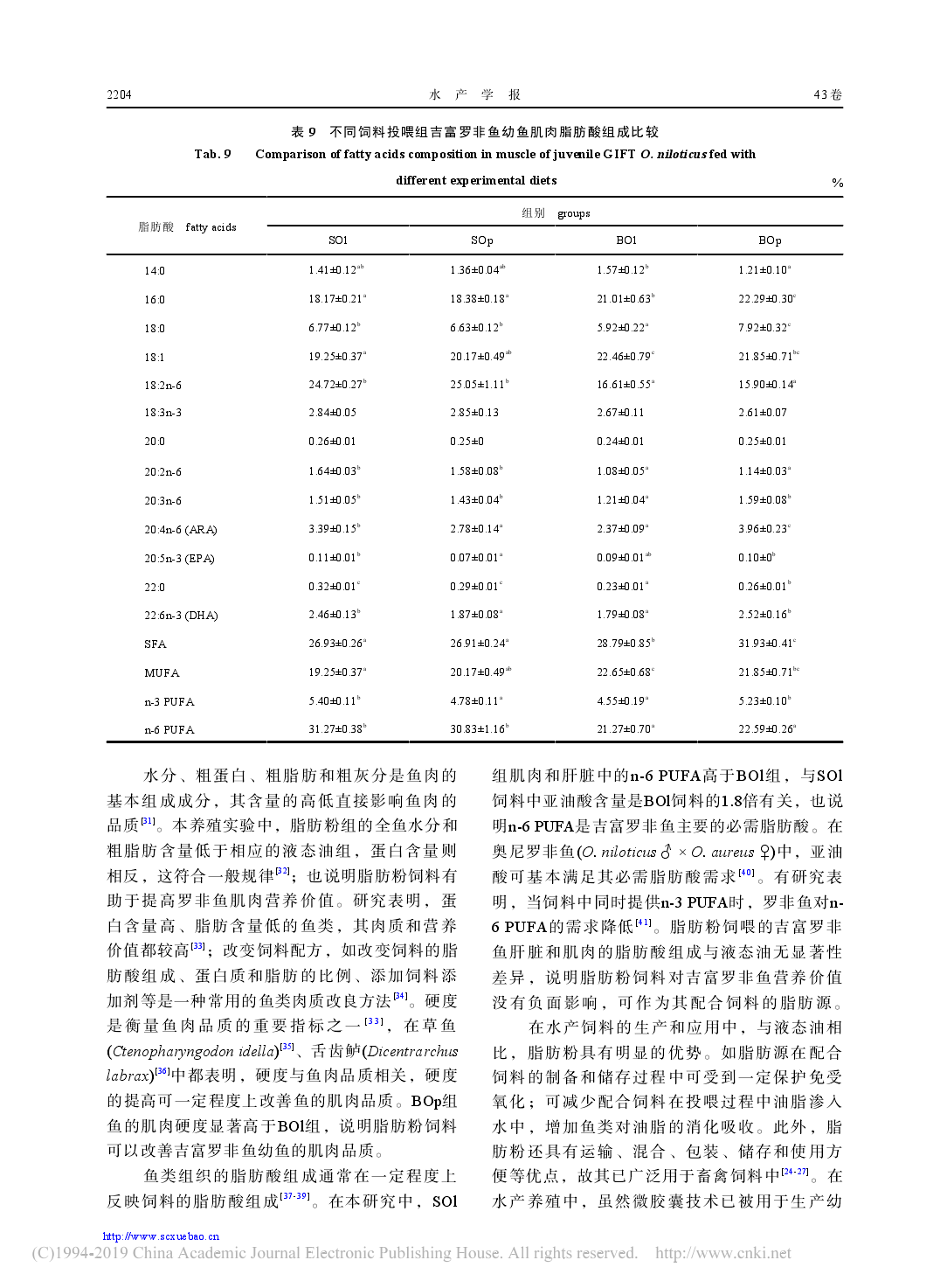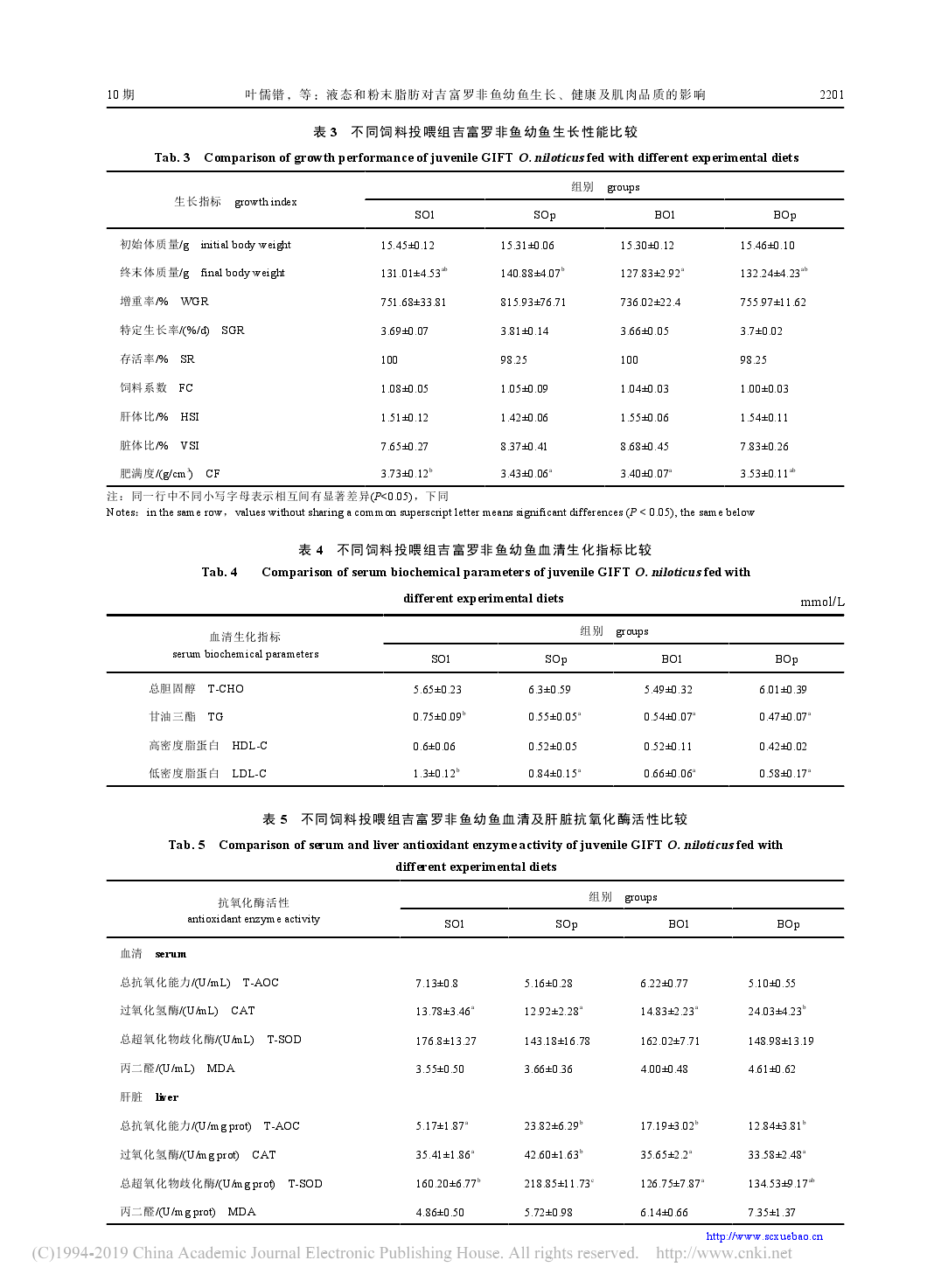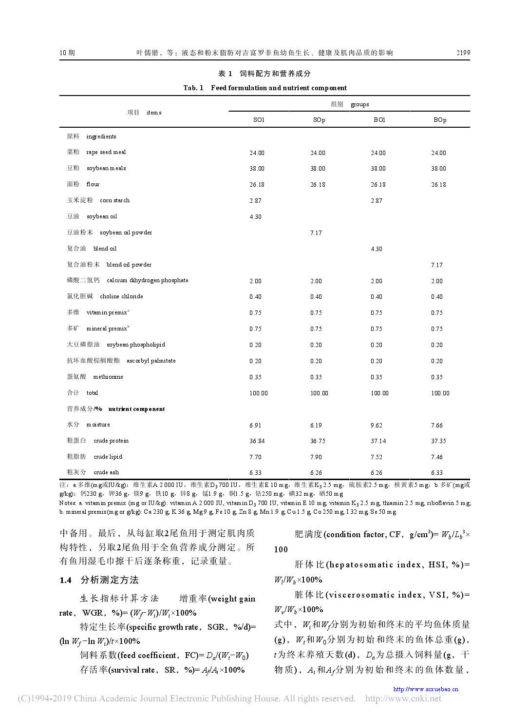 摘要:在目前的水产配合饲料生产中,油脂一般以液态形式添加到饲料原料中或者在真 空环境中喷涂到饲料颗粒上,以脂肪粉进行应用的研究报道很少。本研究以豆油(SO, 亚油酸∶亚麻酸=9∶1)和一种由豆油和菜籽油等组成的复合油(BO,亚油酸∶亚麻 酸=5∶1)为脂肪源,分别以液态和粉末形式添加到饲料原料中制备4种配合饲料(SOl、 BOl、SOp、BOp)。用其在室内水族箱中喂养初始平均体质量为15.38 g的吉富罗非鱼幼 鱼8周后,各饲料投喂组鱼的增重率、特定生长率、饲料系数、肝体比、脏体比无显著 性差异。与豆油饲料(SOl)投喂组鱼相比,SOp组的肝脏过氧化氢酶及超氧化物岐化酶活 性显著升高、肌肉粗灰分含量显著降低,SOp、BOl、BOp组的血清甘油三酯和低密度脂 蛋白水平、全鱼的水分含量都显著降低,肝脏总抗氧化能力、全鱼粗蛋白含量及肌肉剪 切力都显著升高。此外,BOp组的血清过氧化氢酶活性及肌肉硬度显著高于SOl、BOl、 SOp组。肝脏和肌肉的脂肪酸组成各组间差异不大,均反映饲料的脂肪酸组成。研究表 明,与液态油相比,脂肪粉饲料对吉富罗非鱼幼鱼的生长无不良影响,且可改善鱼的健 康及肌肉品质;复合油的效果优于豆油。结合脂肪粉具有包装、运输、储存、添加方便 等优点,值得在水产养殖生产中进行推广应用。