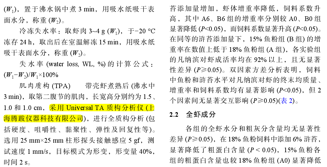 2021年,上海海洋大学研究人员在国内期刊《水产学报》在线发表了题为“饲料中添加浒苔对凡纳滨对虾生长性能和肌肉品质的影响”的研究文章。在该论文中,研究人员使用上海腾拔仪器科技有限公司的Universal TA质构仪来测定纳滨对虾的硬度、弹性、咀嚼性、黏聚性和回复性