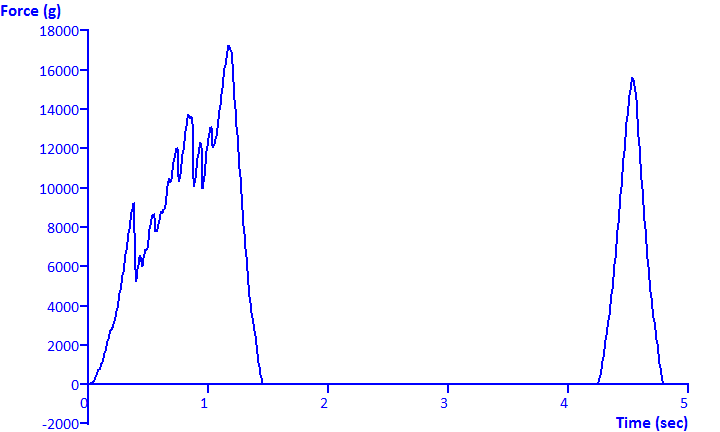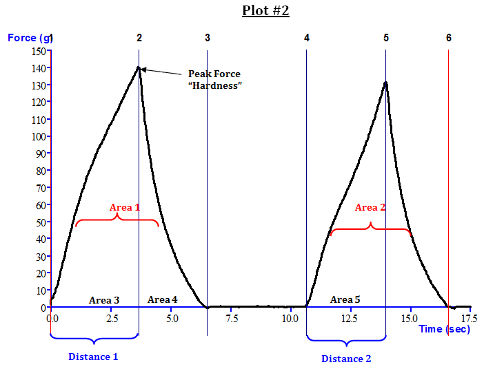 不是所有的产品都有脆性,但是在探头第1次压缩样品的过程中,当它们破裂时,在曲线有第1个峰的位置(在该处力值下降),出现脆性点。 | |||||