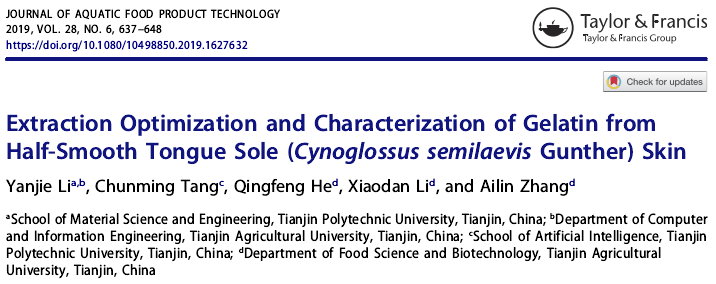 Technical articles2019年6月24日,食品期刊《Journal of Aquatic Food Product Technology》在线发表了天津工业大学材料科学与工程学院研究团队题为“Extraction Optimization and Characterization of Gelatin from Half-Smooth Tongue Sole (Cynoglossus semilaevis Gunther) Skin”的研究论文。