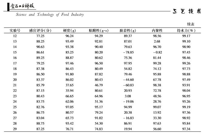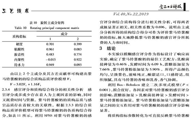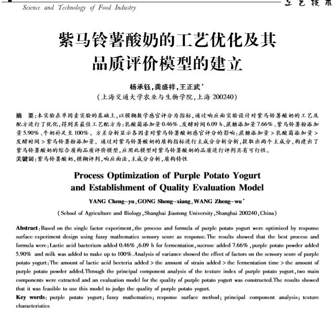 【摘要】:本实验在单因素实验的基础上,以模糊数学感官评分为指标,通过响应面实验设计对紫马铃薯酸奶的工艺及配方进行了优化,得到其*工艺配方为:乳酸菌添加量0.46%、发酵时间6.09 h、蔗糖添加量7.66%、紫马铃薯粉添加量5.90%、牛奶补足至100%。方差分析显示各因素对紫马铃薯酸奶感官评分的影响:蔗糖添加量乳酸菌添加量发酵时间紫马铃薯粉添加量。通过对紫马铃薯酸奶的质构指标进行主成分分析分析,提取出两个主成分,构建出了紫马铃薯酸奶的综合质构品质评价模型,应用此模型对紫马铃薯酸奶的品质进行评判具有可行性。