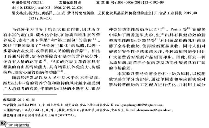 Technical articles2019年,上海交通大学农业与生物学院研究人员在国内食品期刊《食品工业科技》在线发表了题为“紫马铃薯酸奶的工艺优化及其品质评价模型的建立”的研究论文。在该论文中,研究人员使用上海腾拔Universal TA质构仪测定紫马铃薯酸奶的硬度、粘附性、胶着性和内聚性等指标。
