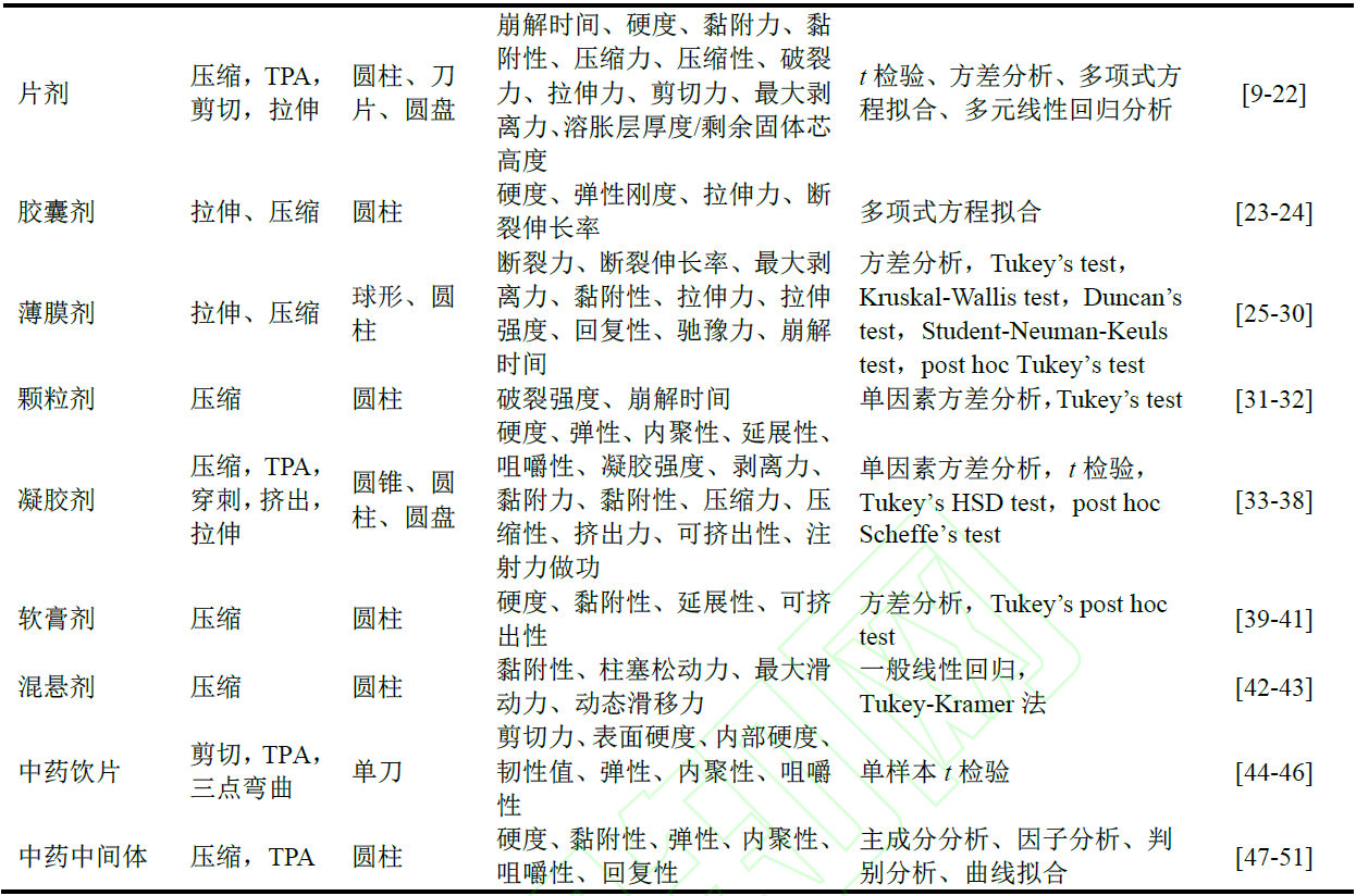 根据样品的自身特性,质构仪有多种探头(圆盘、圆柱、单刀探头等)和多种分析模式(压缩、穿刺、剪切、拉伸模式等)可供选择,不同物性参数可结合多种数据分析手段(方差分析、回归分析和t 检验等)以达到研究目的。其中应用广泛的是压缩模式,探头以恒定速度下降,压缩样品到某一设定目标(如一定的形变量、下压距离)后立即返回,可以反映制剂的硬度、黏附性、内聚性等多种物性参数。对于物性参数的数据分析方法,主要包括统计检验与回归分析2 种手段,通过方差分析和t 检验可比较不同处方或不同测定方法下制剂物性参数之间的差异,用于体内外相关性评价、不同处方之间的质量评价;回归分析可将一系列物性参数与工艺参数或质量评价指标进行方程拟合,找到关键物性参数与制剂质量之间的定量关系及相互影响规律。对近年来质构仪在制剂研究中的应用文献进行总结,见表2。