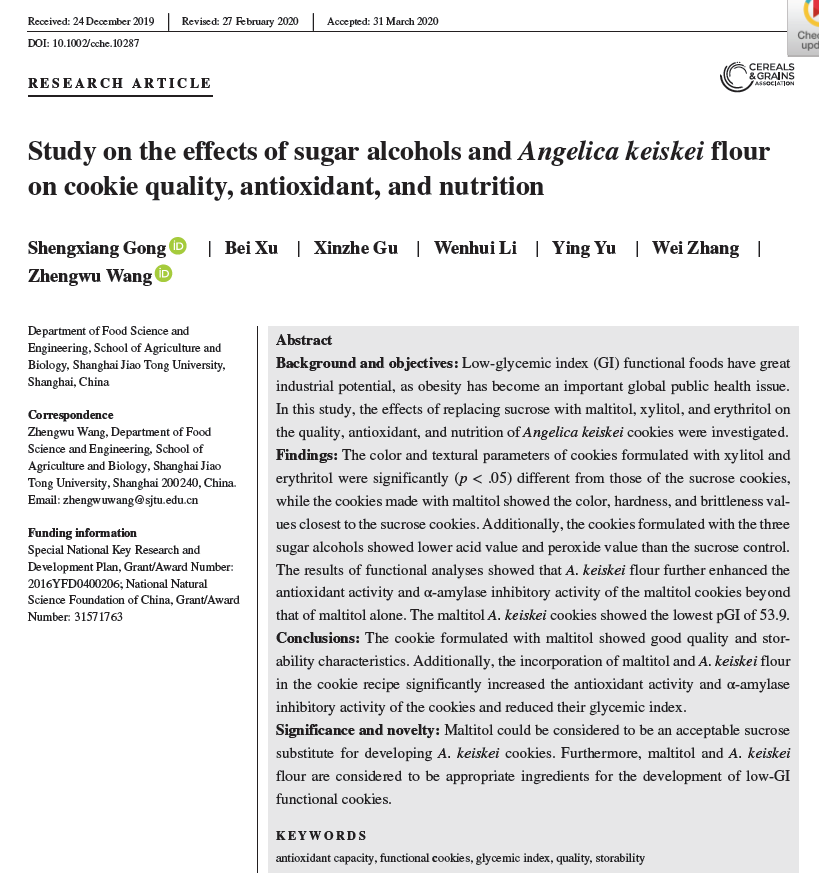 Technical articles2020年3月,食品期刊《Cereal Chemistry》(IF=1.807)在线发表了上海交通大学农业与生物学院食品科学与工程系研究人员题为“Study on the effects of sugar alcohols and Angelica keiskei flour on cookie quality, antioxidant, and nutrition”的研究论文。
