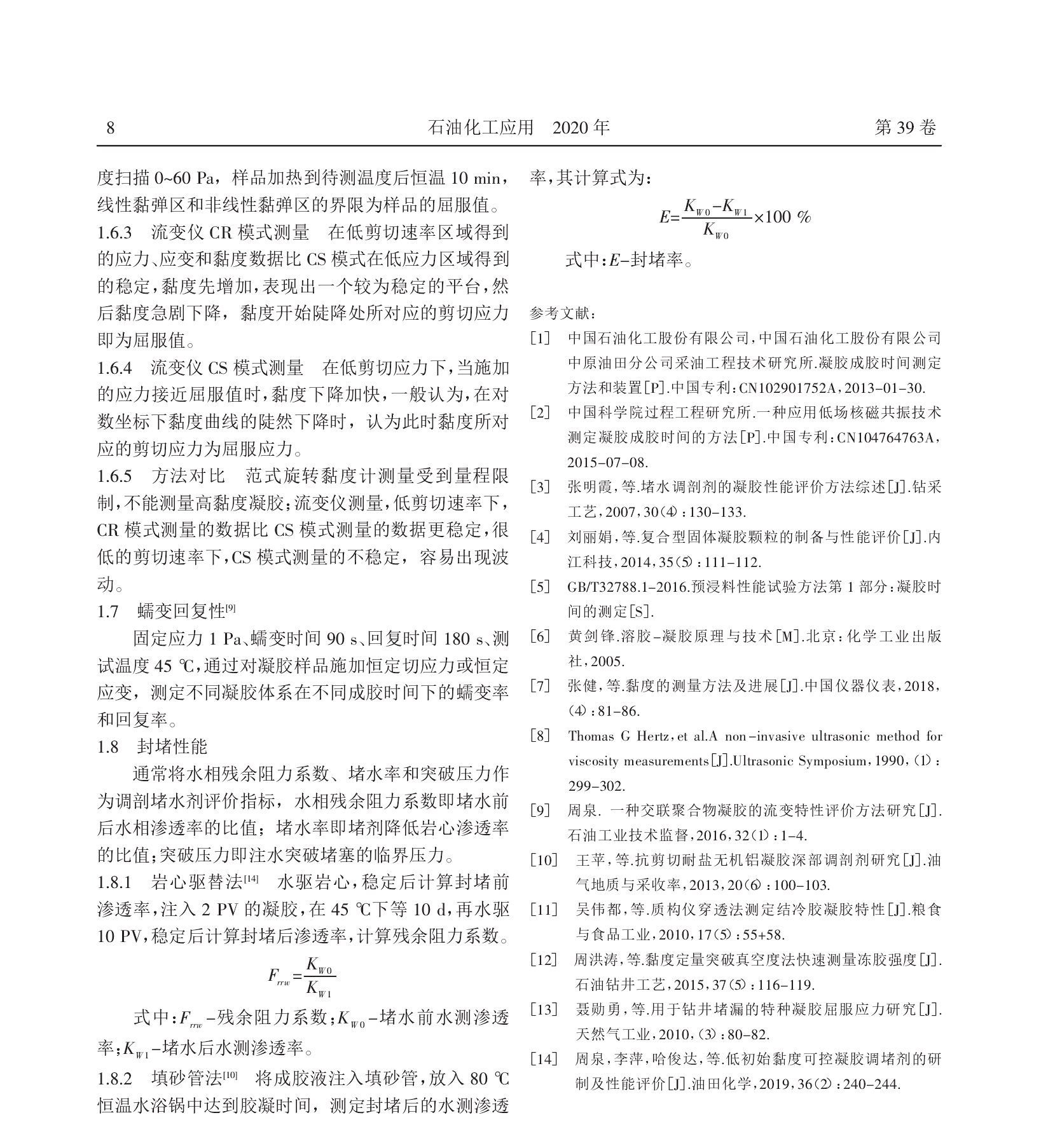 Technical articles凝胶作为常用的封堵材料,在老油田控水稳油中有重要的地位,研究其性能显得至关重要。本文通过实验和查找文献,介绍了凝胶性能测定及评价,包括凝胶的成胶时间、黏度、黏弹性、抗剪切性能、强度、屈服应力、蠕变回复性和封堵性能。通过对凝胶性能测定及评价综述,为实验研究、现场工作中凝胶性能及评价提供全新的参考。