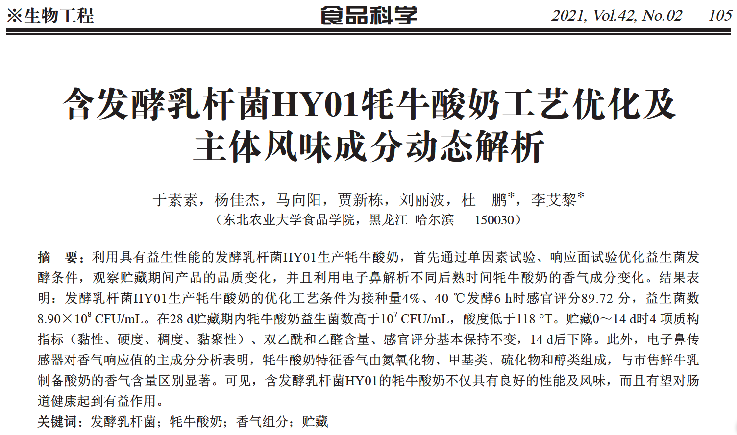 Technical articles2021年,东北农业大学食品学院研究人员在国内食品期刊《食品科学》在线发表了题为“含发酵乳杆菌HY01牦牛酸奶工艺优化及主体风味成分动态解析”的研究文章。在该论文中,研究人员使用上海腾拔仪器科技有限公司的Universal TA质构仪来测定牦牛酸奶的硬度、稠度、内聚性和粘性指标。