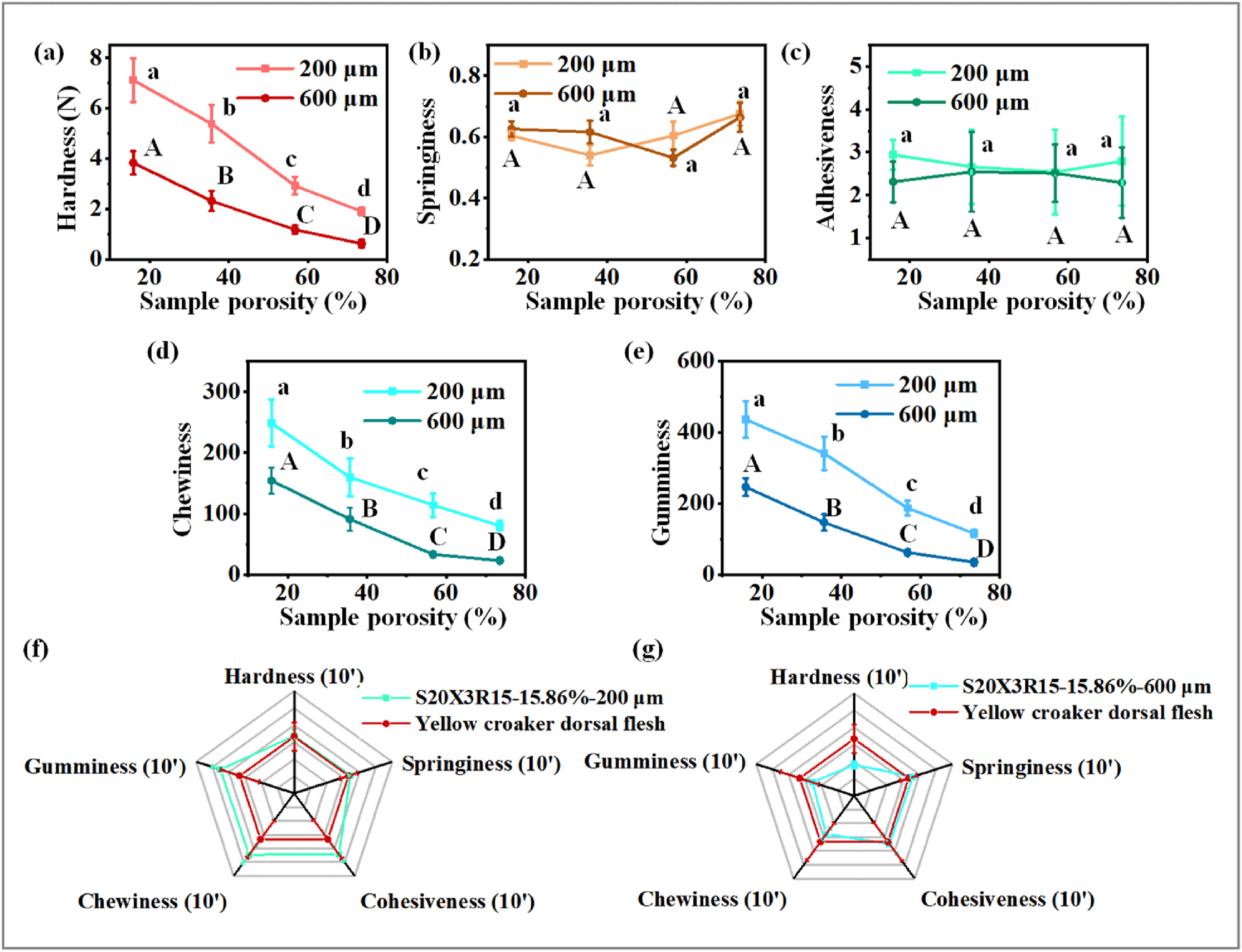 仿肉和仿鱼的质构显著受其结构、力学和表面性质所决定。一些质构指标可以通过全质构分析来测定,包括硬度、弹性、粘附力、咀嚼性和胶粘性。前三者为初级质构指标,后两者为次级全质构分析变量。在该研究中,研究人员使用200 μm或600 μm喷嘴制造的不同孔隙率打印样品,将其蒸制,然后探究其质构特性,并将其与黄花鱼背部肌肉对比。为了说明打印样品与真实鱼的相似,我们将黄花鱼背部肌肉每个质构指标的平均值定义为10分。仿鱼打印样品相应的平均值和标准差根据比例也被计算。